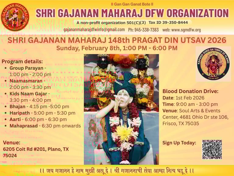 We are delighted to announce that Shri Gajanan Maharaj 148th Pragat Din Utsav 2026 will be celebrated on 8th Feb 2026. We warmly invite you and your family to join us and be a part of this auspicious occasion. Program Details as below -